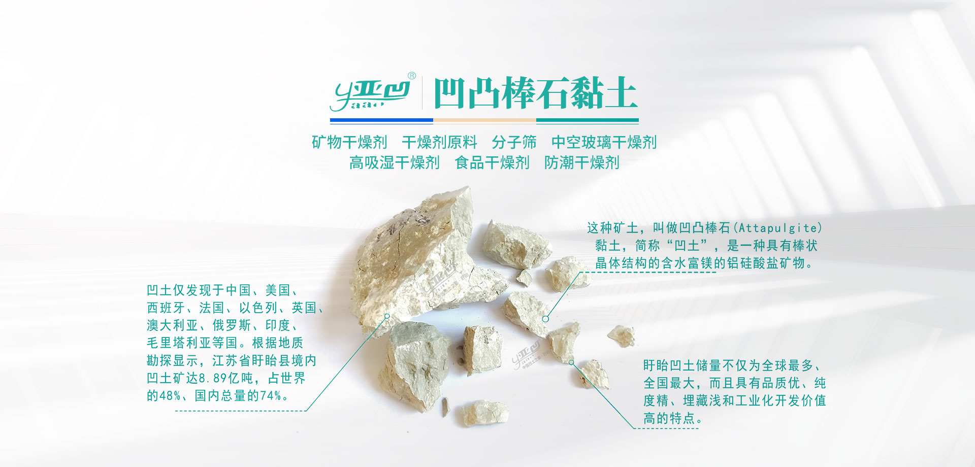 盱眙亞凹干燥劑科技有限公司(原盱眙雙鎮工貿有限公司),成立于2008年,公司位于全國凹凸棒石黏土儲量產區——盱眙縣,緊鄰121省道和331省道,距離新揚高速入口僅15公里,公司占地面積25畝,廠房面積3500平方米,年產量15000噸以上,是集干燥劑科研、生產、銷售于一體的綜合性企業。